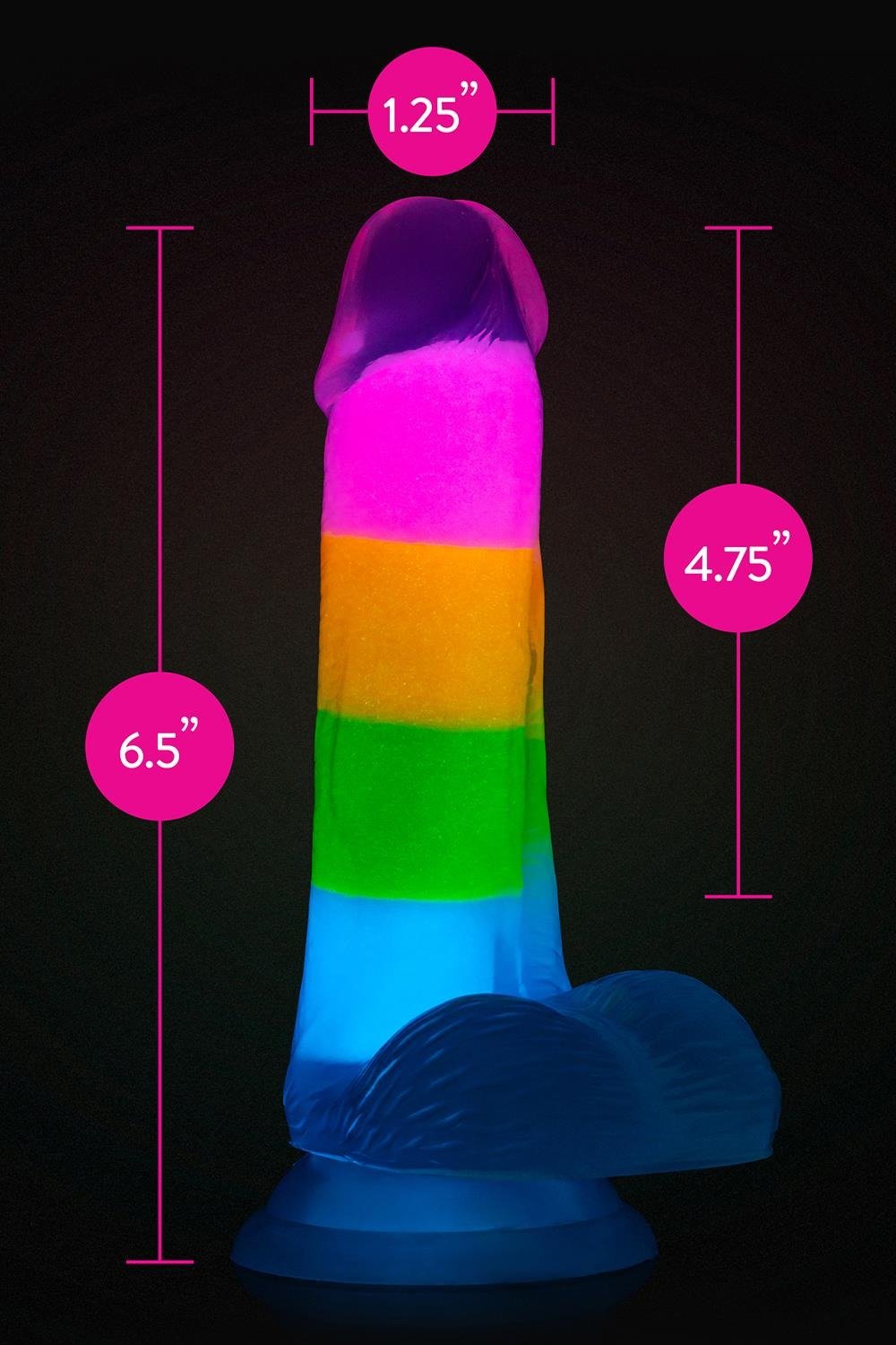 Сумісна з присоскою основа забезпечує універсальне задоволення – закріпіть його на будь-якій гладкій поверхні для задоволення без допомоги рук або пристебніть його для гри з партнером. Приглушіть світло і дозвольте Rainbow Rave висвітлити вашу ніч хвилями екстазу, що світяться.