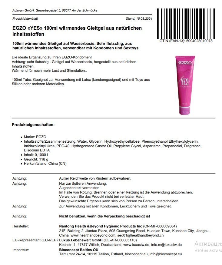 Лубрикант EGZO «YES» у практичному тюбику забезпечує додаткову зігрівальну стимуляцію в інтимні моменти. Формула на водній основі з натуральними інгредієнтами забезпечує гладке та приємне ковзання.