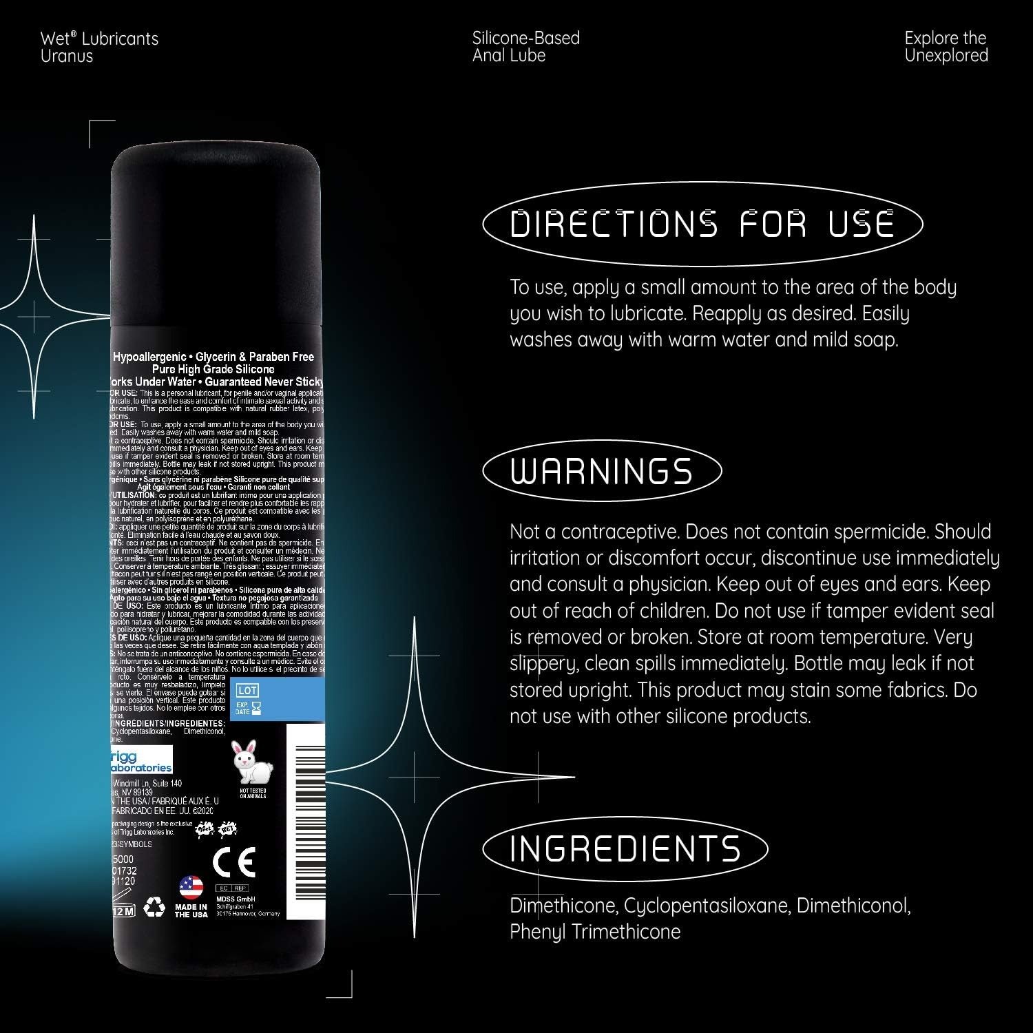 Wet Uranus не містить анестетиків та парабенів. Стійка мастильна плівка, без запаху та кольору, дає дуже еластичне та шовковисте відчуття для досягнення максимальної насолоди.