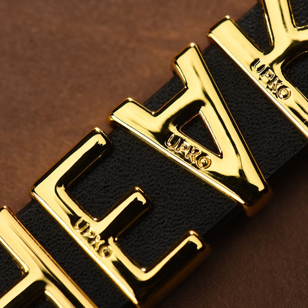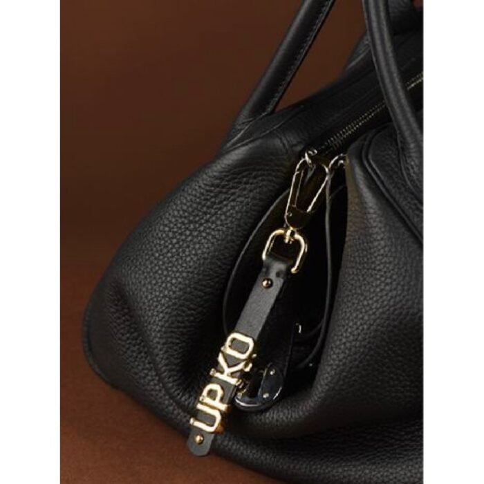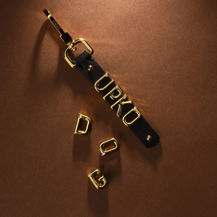 Чорна натуральна шкіра особливо підкреслює сяйво кожної букви, а міцний карабін гарантує надійне кріплення