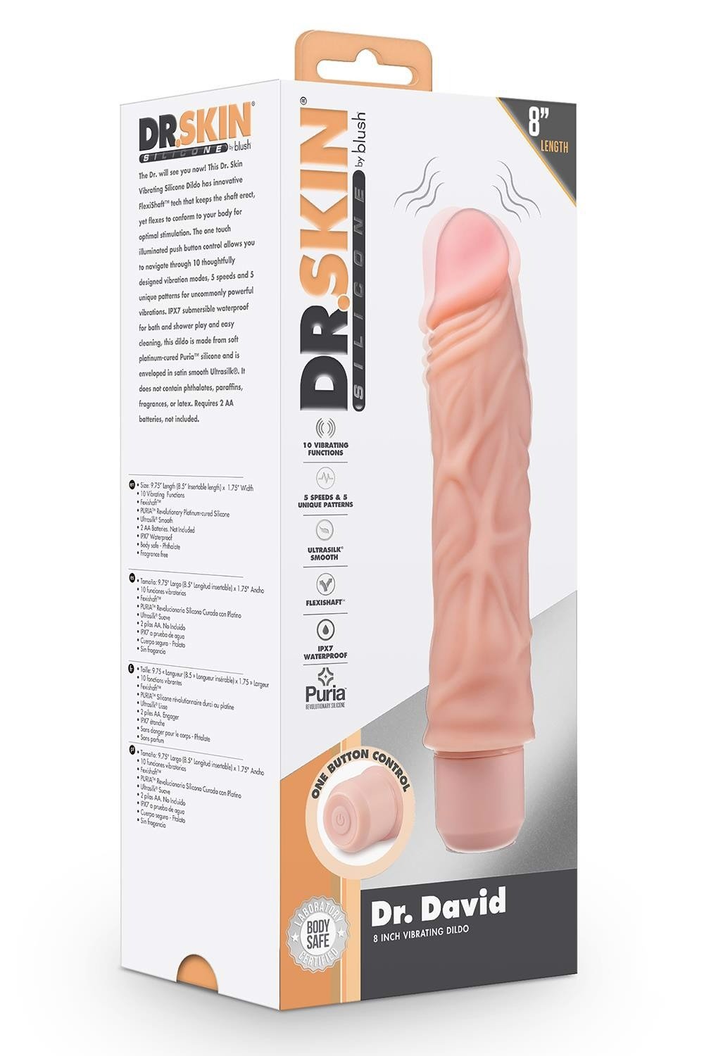 Цей вібруючий силіконовий фалоімітатор Dr. Skin оснащений інноваційною технологією FlexiShaft™, яка утримує стрижень у вертикальному положенні, але згинається, пристосовуючись до вашого тіла для оптимальної стимуляції.