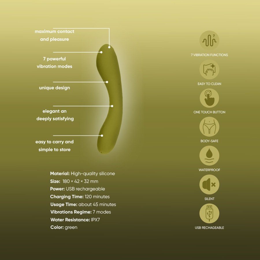 Ніжна поверхня та плавні лінії роблять контакт максимально комфортним, а насичені вібрації розкривають весь спектр насолоди. Компактний та легкий, він зручно лягає в руку, дозволяючи повністю контролювати процес. Завдяки ергономічному вигину іграшка м'яко повторює анатомію, посилюючи кожен дотик. Він ніби створений, щоб викликати захоплення і розбурхувати фантазію.