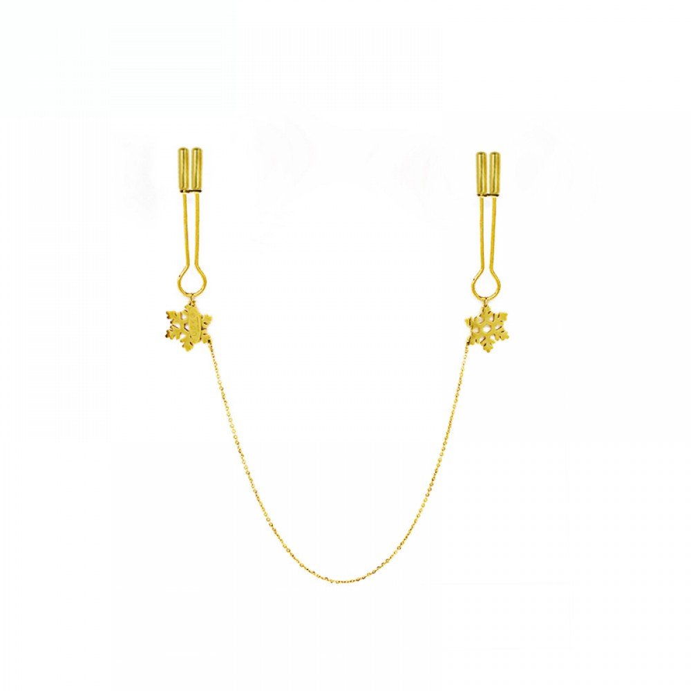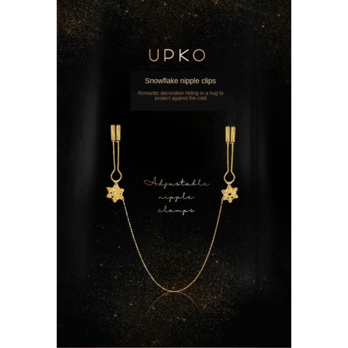 Затискачі для сосків від UPKO дозволять вам розкрити свою чуттєвість і підвищити сприйнятливість. Вони підходять як для досвідчених цінителів, так і для новачків. Унікальна звисаюча форма сніжинки і мідне покриття з золотистим відтінком привертають увагу. Затискачі дозволять вам випробувати солодкі відчуття від болю. Завдяки вишуканому дизайну і продуманій формі вони ідеально підійдуть до вас і вигідно підкреслять ваші груди. Сила тиску на соски регулюється за допомогою зручної дужки. Ланцюжок між затискачами чіпляє погляд і заворожує, ви точно будете в центрі уваги! Але це не просто прикраса, це спусковий гачок для еротичної енергії. Ланцюжок допоможе вашому партнерові контролювати ваші рухи під час гри. Завдяки цим затискачам ви будете дуже активно відгукуватися на ласки. Не відмовляйте собі в такому задоволенні і увійдіть в коло обраних власників аксесуарів від UPKO!